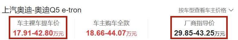 价格方面,奥迪Q5 e-tron售价29.85-43.25万元,车主提车价为17.91万元起,相当于标配车型的价格优惠了11.94万元,优惠力度之大,在上汽奥迪旗下的车型中还是很少见的。